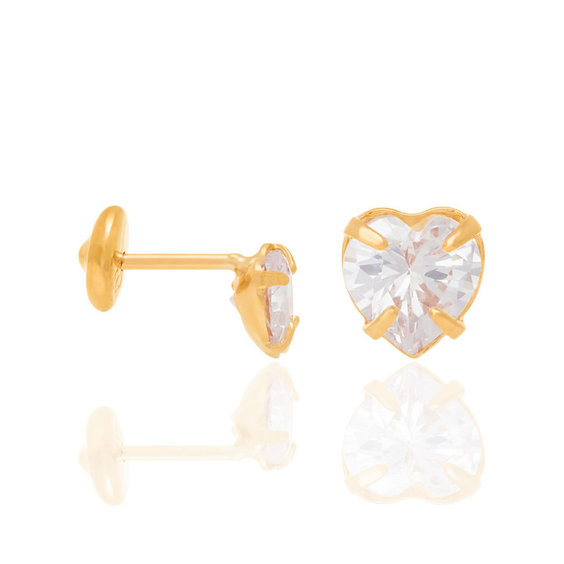 Brinco infantil ou bebê solitário de zircônia, no formato de coração com tarraxa protetora tipo "bebê", medindo 5,0 mm