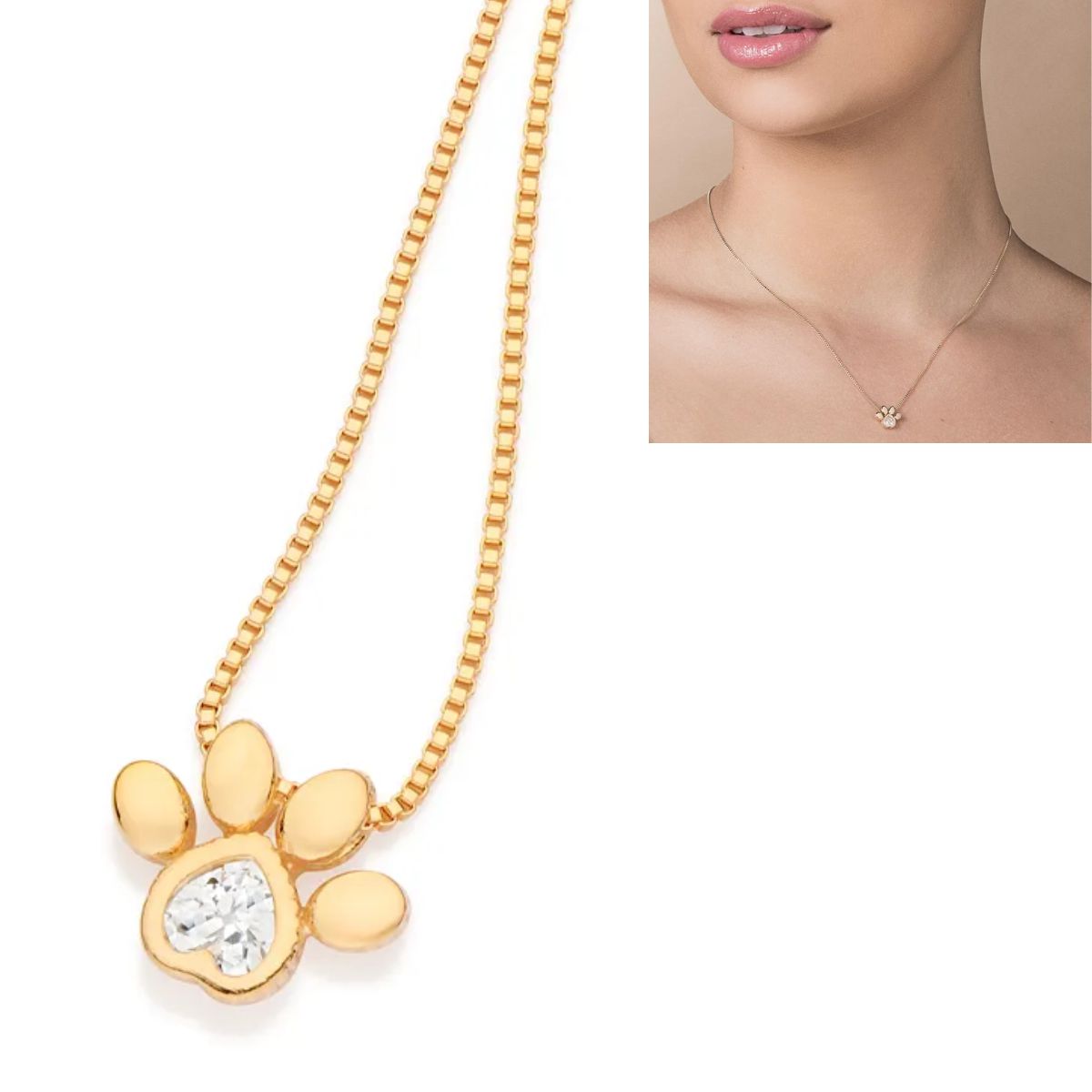 Gargantilha formada por corrente veneziana, fio 080 mm, composta por pingente de pata de pet com 1 zircônia de coração de 4 x 4 mm.