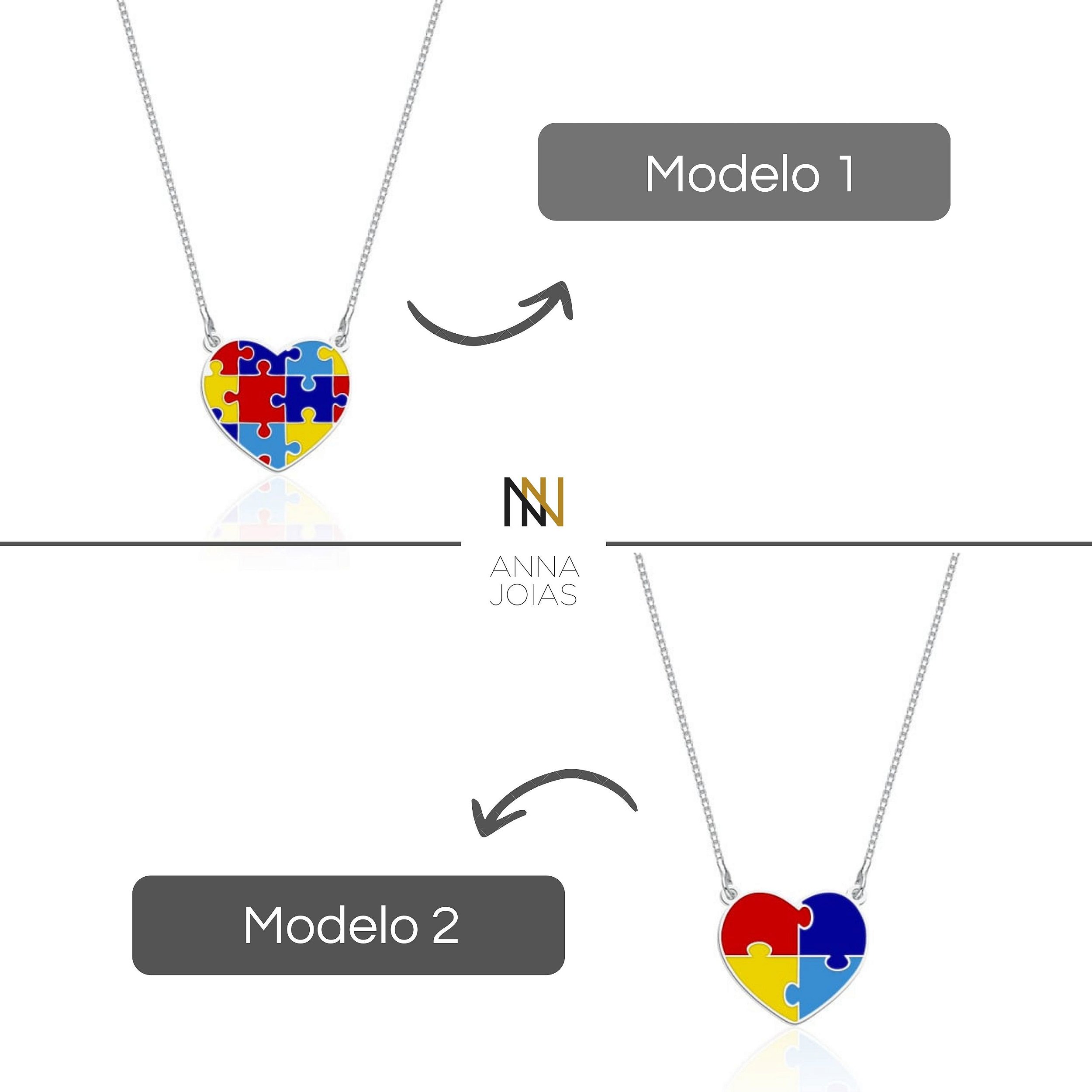 Gargantilha em Prata 925 com pingente fixo de coração com o símbolo do Autismo (peças de quebra cabeça) em resina colorida.