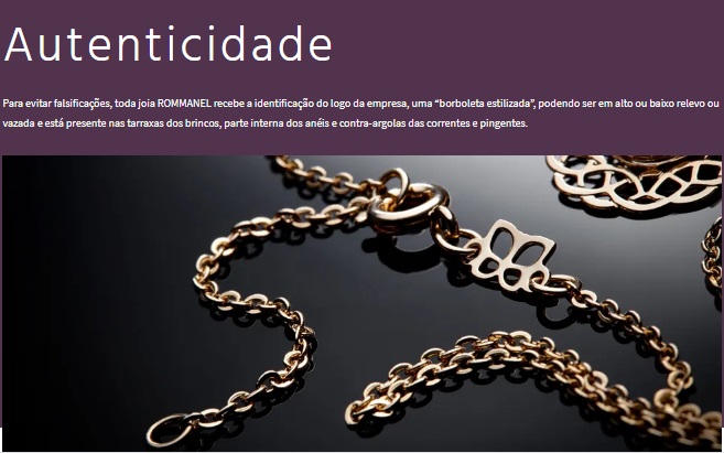 Todas as joias ROMMANEL são identificadas pela grafia estilizada de uma borboleta que serve para garantir a autenticidade dos produtos. Esta marca é feita nas tarraxas dos brincos, nas contras-argolas das correntes, cordões e pingentes, bem como na parte interna dos anéis.