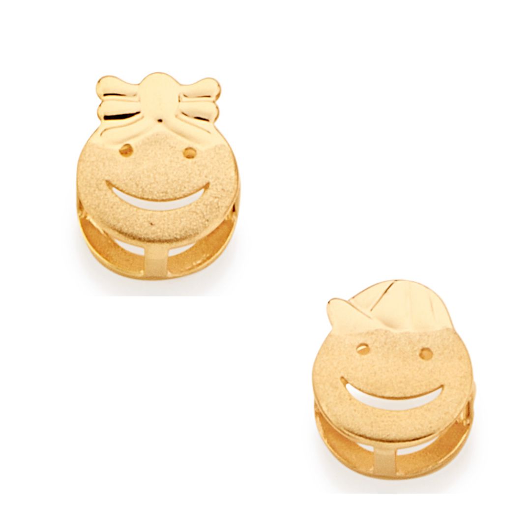 Pingente trabalhado no formato de rosto de "Menino Boné / Menina Laço", com trabalho acetinado, medindo 1,00 cm.