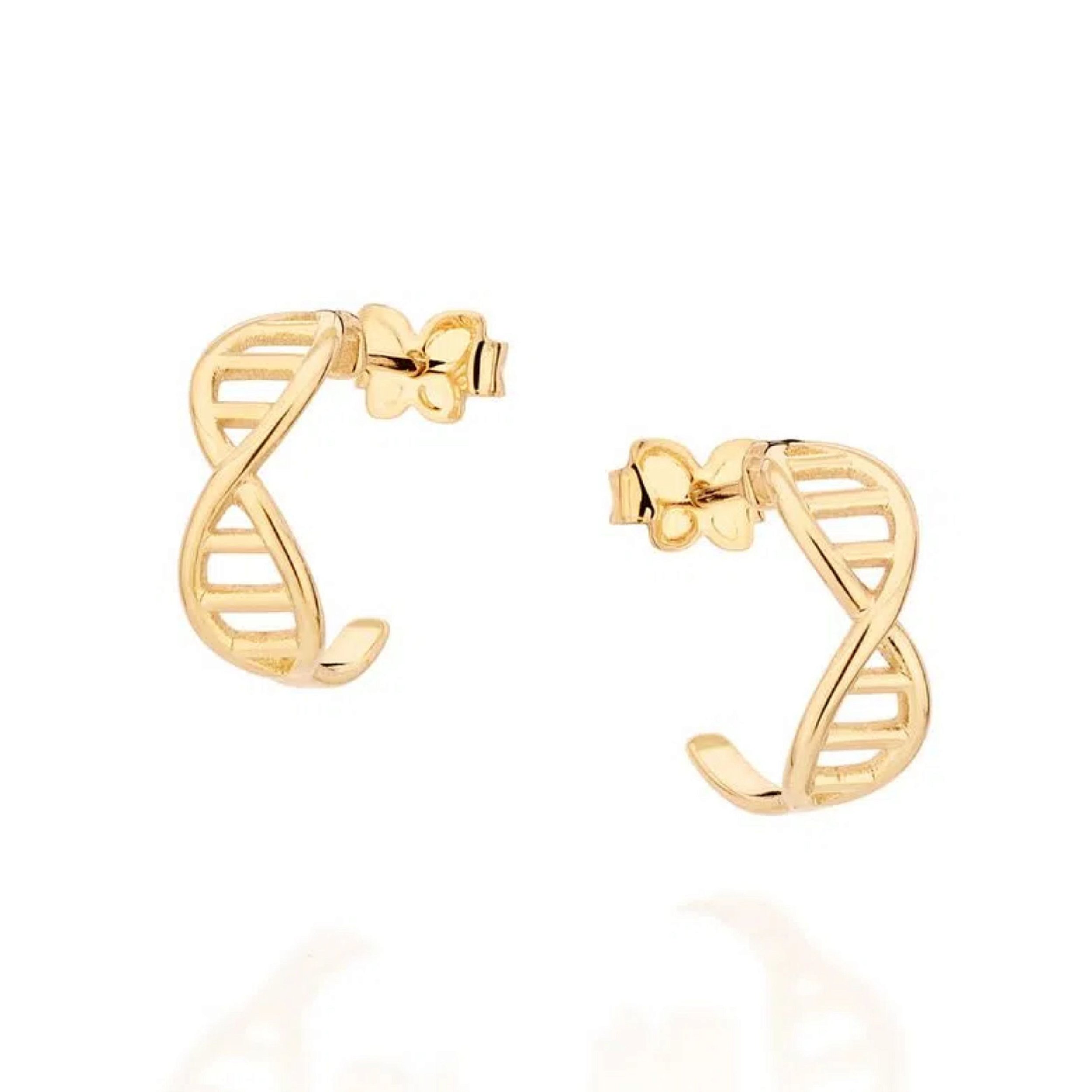 Brinco meia argola no formato de cromossomo, medindo 1,4 cm de diâmetro.