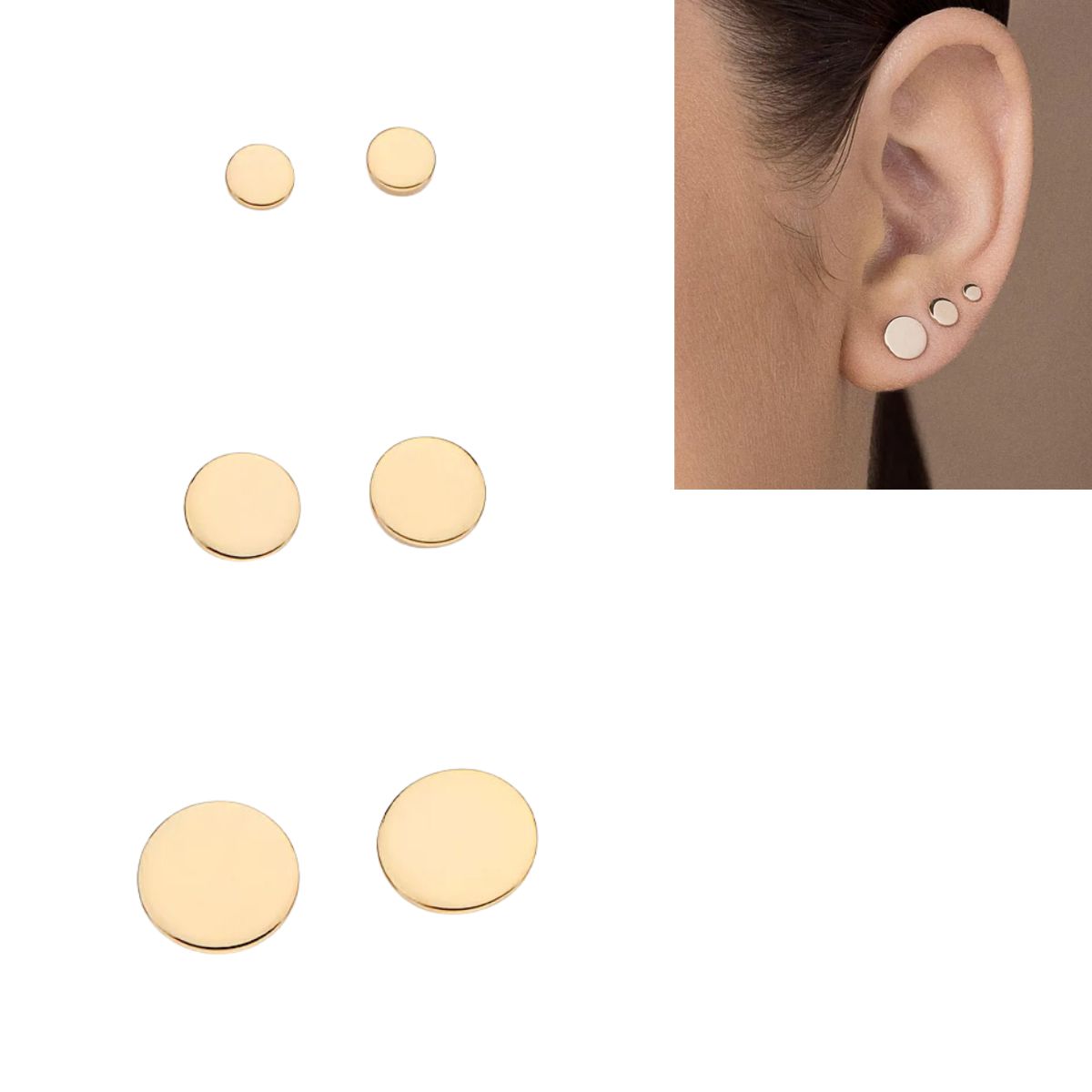 Kit composto por 3 pare de brincos, formado por 1 par redondo liso de 7,00 mm, 1 par redondo liso de 5,00 mm e 1 par redondo liso de 3,00 mm .